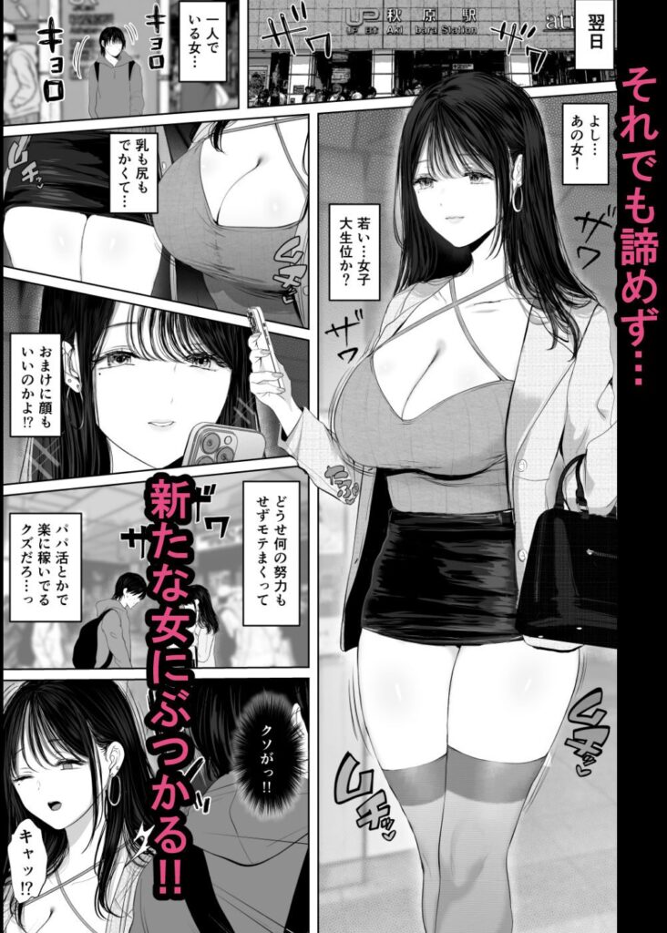 何だあの女、乳も尻もでかくて…おまけに顔もいいのかよ!?クソ、あいつにぶつかってやる。ドンッ。